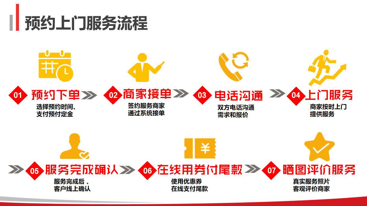 爽约赔付:因服务技师未能按订单既定的预约时间上门服务而造成用户不便时,则平台可先行对该订单退款赔付。