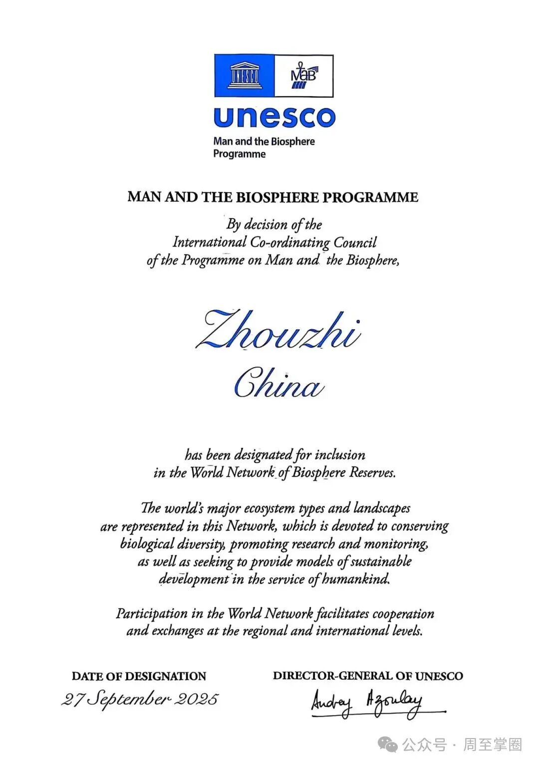 2025年9月27日,于浙江杭州临安召开的联合国教科文组织“人与生物圈计划”国际协调理事会第37次会议传来喜讯:陕西周至国家级自然保护区(以下简称“周至保护区”)的加入申请经大会审议并全票通过,正式获准加入“世界生物圈保护区网络”。这是2018年以来,世界生物圈保护区再次向中国打开大门,是秦岭北麓首家入选的保护区,标志着周至保护区在生态保护与可持续发展领域的卓越实践获得了国际最高级别的认可,其“秦岭样本”正式登上全球舞台。