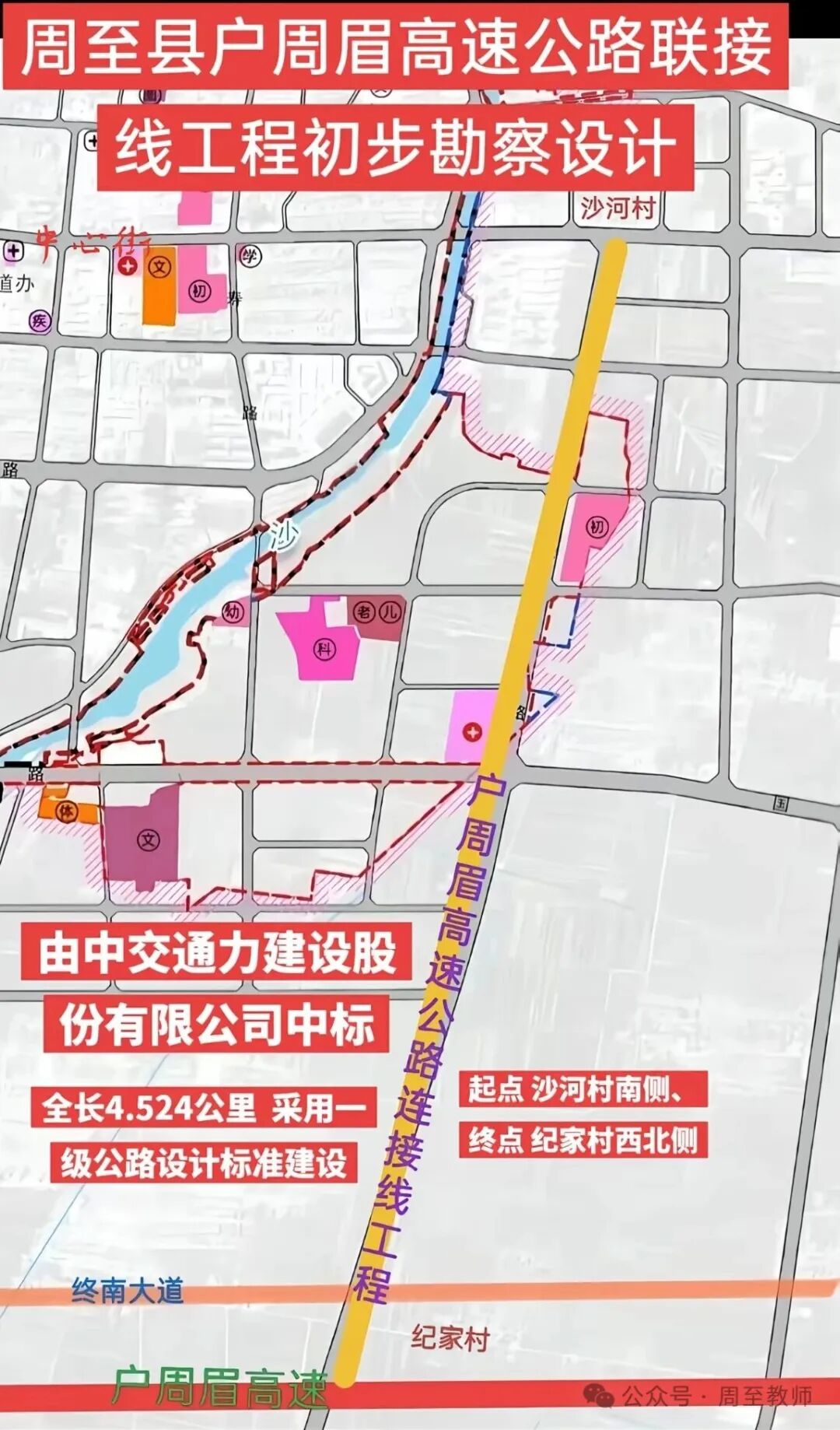周至县鄠周眉高速公路联接线工程初步勘察设计,由中交通力建设股份有限公司中标,全长4.524公里,采用一级公路设计标准建设,起点为沙河村南侧,终点为纪家村西北侧终南大道。